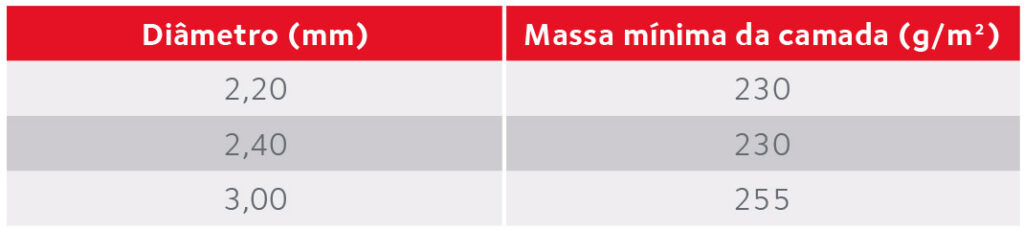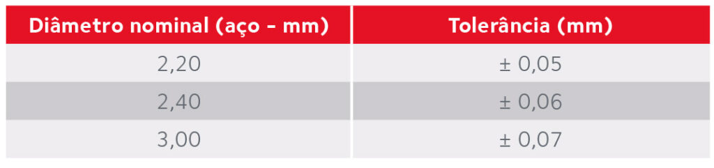 Admite-se uma tolerância no diâmetro do arame zincado, conforme Tabela abaixo, de acordo com as especificações da NBR 8964:2013: